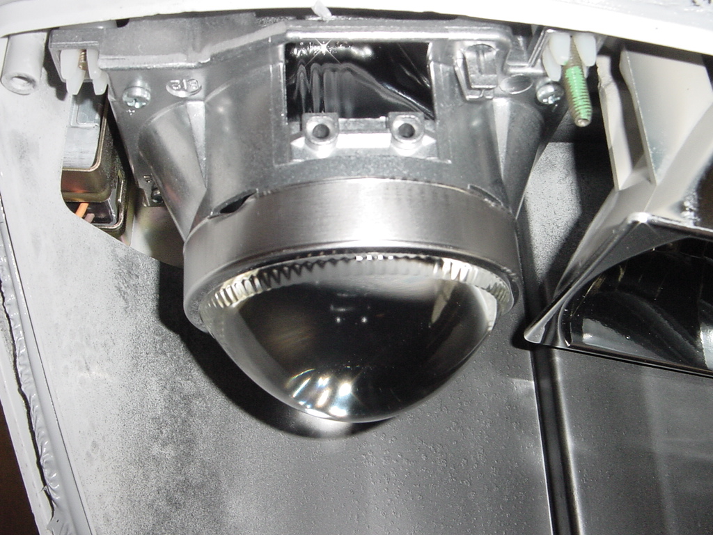 I trimmed both shields off on a bench grinder and repainted the cut edge flat black. They shields are symmetric so it doesn't matter which one goes into which head light. I reassembled the projectors and reinstalled them in the head lights. Oven 200 degrees 25 min. The butyl tar became perfectly soft and the weight of the glass was enough to setting perfectly back into place. I reinstalled the metal retainer clips onto the headlight while they where still warm from the oven. I let the whole assemblies cool to room temp before reinstalling any of the other parts. DS installed