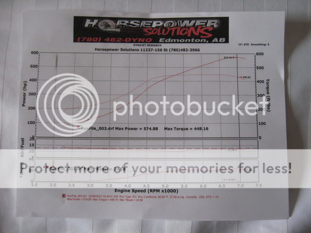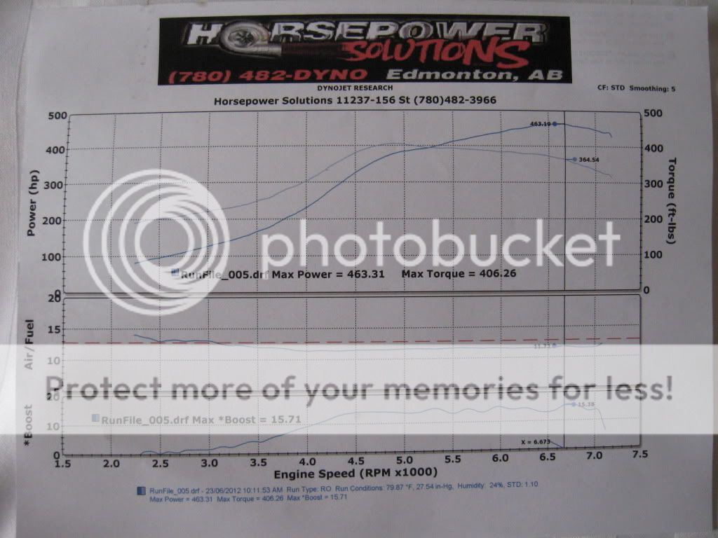 Hi folks, I'm here in Edmonton, AB with SpecialtyZ and have just finished getting my car tuned. As it has been said many times before Seb and Greg are top notch! Definitely the place to go or people to get when you need your car tuned. It was a great experience and I was pretty nervous. I had not pushed the car beyond 11 psi so had no idea what to expect. Of course I am happy with my dyno numbers otherwise I wouldn't be posting anything :-). I had 2 tunes: a) 94 octane and b) VP 109 octane. Here is the 94 octane chart:
