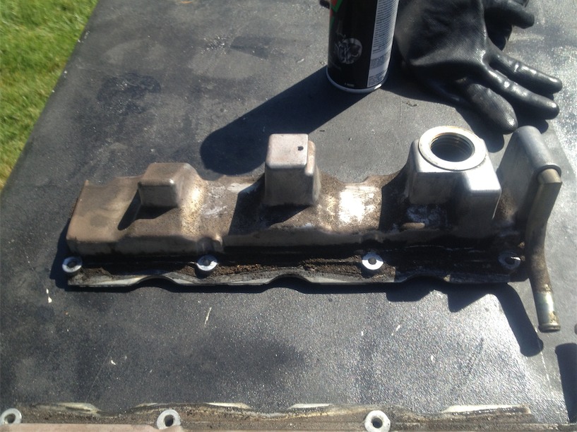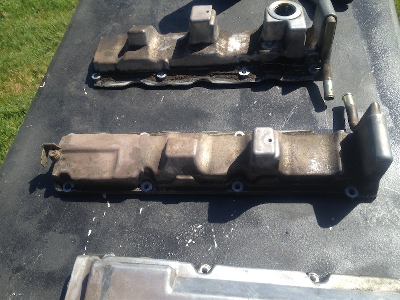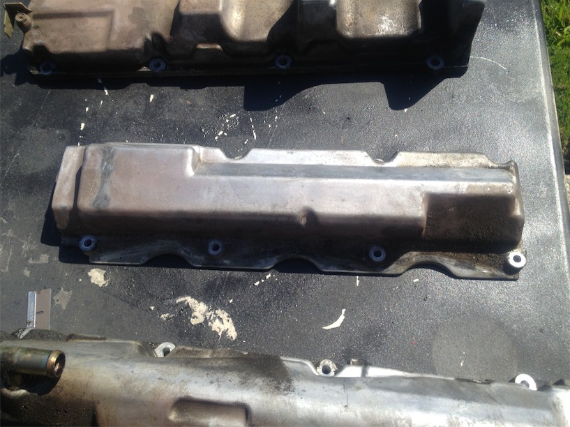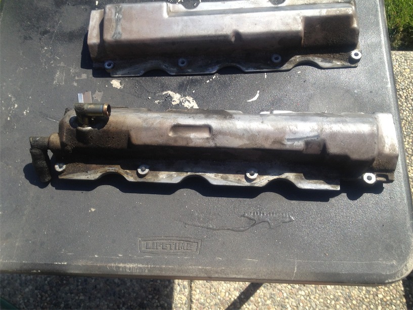 weekend. On Monday, I took my messed up valve covers to a powder coater near me. I tried to strip the paint myself but I made the situation worse. I didn't strip much, just ended up smearing the VHT wrinkle plus paint all over the place and made a mess of it. Unfortunately, I didn't take any pictures of the carnage that I caused. I only have before pictures and after pictures. The valve covers came out beautifully but my iPhone 4S camera takes crappy pictures indoors. I was originally told that they would be done by Friday close of business but he was finished with them this morning. How awesome is that? I dropped them off along with my chrome plenum at my mechanic's shop and that is the last of my parts that were outstanding. My next posts should be of my car back together before ZCON. Valve covers fresh off the engine. So grimy, dirty, and nasty with 186,800 miles on them...