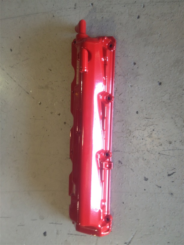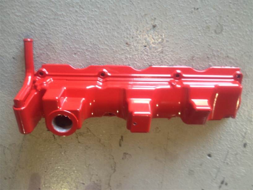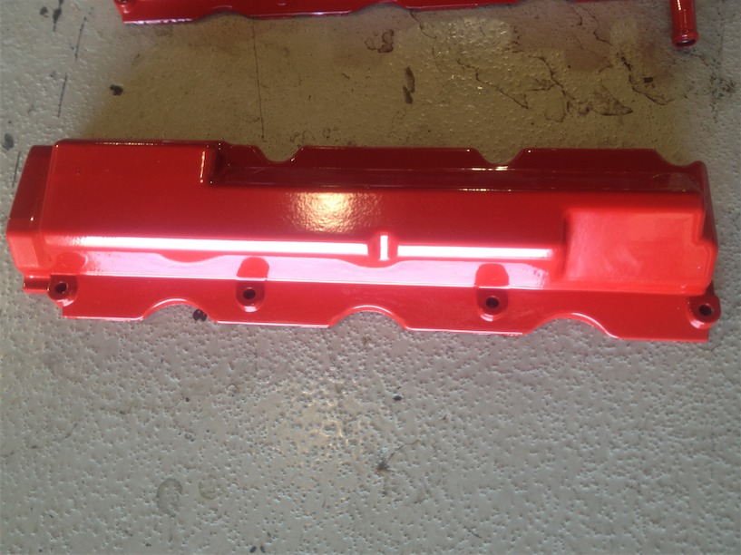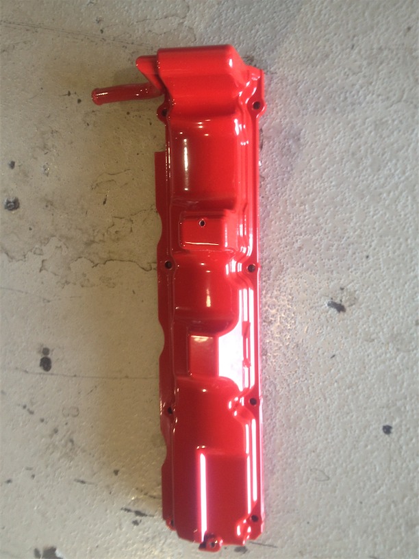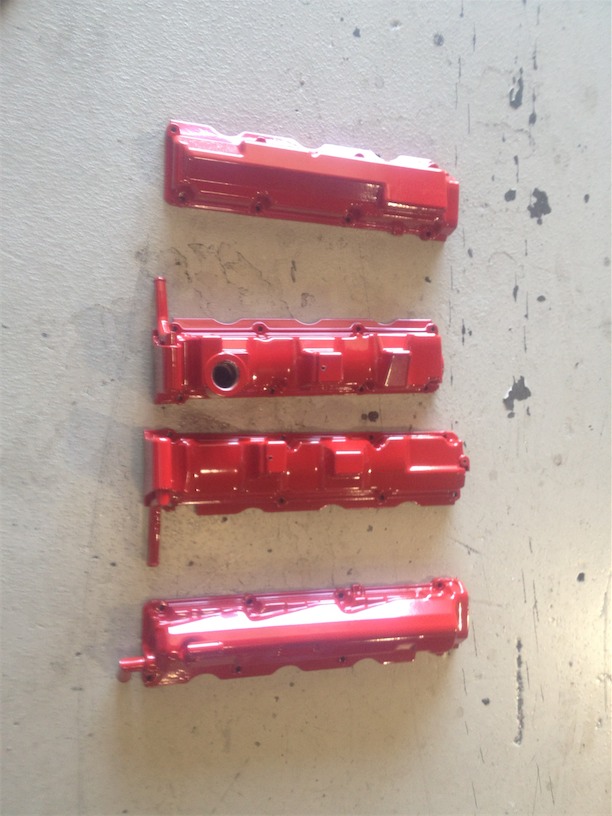Here is the finished product fresh from the powder coaters. They charged me $200.00 for stripping off the VHT paint nightmare with Jasco, media blasting, and then powdercoat. I was told that it would be a bit cheaper if they didn't have to remove the paint and just had to work with the valve covers after I degreased them...