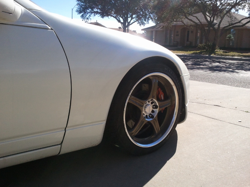 Wheels/Tires/Suspension: My front tires are terribly lacking nowdays and I am ready for an upgrade. Take a look at the pictures and keep in mind I am sitting on some 40mm drag radials in the back on 18" wheels La-Z-Link so I kinda got the stink bug look going on right now. My current setup is 18x9 (235/40/18) in front. I really like the look of these race tires on this Z linked here (scroll down): La-Z-Link but I am afraid my front wheels arent wide enough to run too big of a tire without looking dumb. Can anyone, first of all, recommend a nice grippy tire with good sidewall and handling characteristics, and second of all a tire that is taller and still agressive looking that will fit the 9" wheel and fill the wheel well.