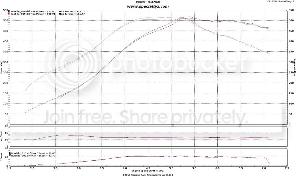 517.4 HP/513.1 torque on 100 (22.8 PSI) and 454.2 HP/463.8 torque on 91 (17 PSI).