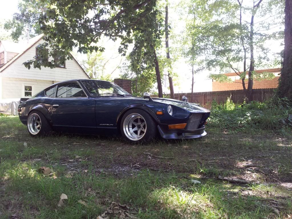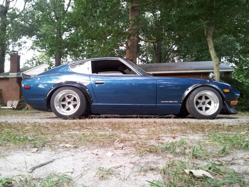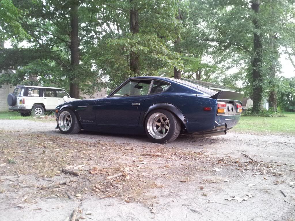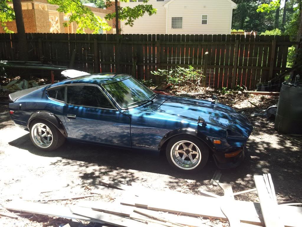 As it nears a road going state. My brother who knows a guy who knows a guy told me about a "rustless" 240Z in a guys garage for the last 30 something years. I said they don't exist but I went and looked anyways. Car is a 11/70, making it a 71. Found it crammed in a garage on casters, with wood working tools, tool boxes, and wood all over it (including the f-ing roof). Fridge magnet test proved it all to be metal of some sort, guys wife gave the owner the angry face, I gave the owner $800, and got it towed home. Original (and solid) floors, crackless original dash. Car was sanded to bare metal, turned up to be all metal, body work took me about a year to do of off and on work. Was missing a lot of parts though. I don't have any pictures of it when I got it, there wasn't much to look at really. This is how it looks today 2 years later, paint work was done in mid January, need to have the now cured paint wetsanded, buffed, and touched up. The fender mirrors and JDM tail lamps are both Nissan original parts I was lucky to get. Still needs some interior bits and bumpers, but it runs awesome, sounds even better. I was particularly proud of the body work, as its my first serious car project, and first time doing body work. The reflections in the panels are flat, and line up better than I could have hoped for. Most S30 people wouldn't agree with what I have done to an early, nearly 95% rustless 240Z. I know I've wrecked the resale value on it, sorry if it offends anyone. I have already had people of the purist sort tell me how I've ruined the car just by describing it to them. Specs are mild: L28ET: Rebuilt, Shaved head, Aeromotive fuel setup w/ adjustable regulator, 2.5" intercooler piping w/ Isuzu Turbo diesel intercooler, 12lb flywheel, shaved crank pulley (single groove), electric fans, Koyo radiator, 12lb boost, Z31 Coil, 10mm tension cables, Pertronix ignitor (Plugs gapped at .46 on this setup), ported intake manifold with 60mm TB. 3" straight pipe exhaust, Braille 11.5lb battery. Fiberglass hood, hatch, poly rear window. Stance coilovers, All poly bushings, Suspension Techniques swaybars, Nismo front control arm spacers, Datsun Comp quick steering knuckles, Wilwood F/R 4pot/2pot w/ separate caliper for parking brake, Wilwood master cylinder. SSR XR-4 Wheels, 15x9.5 -33 and 15x10 -40, Hankook Ventus RS3 tires. Color is closer to home than you would think, its actually Nissan BX7 "Electric Blue" from the D22 Frontier.