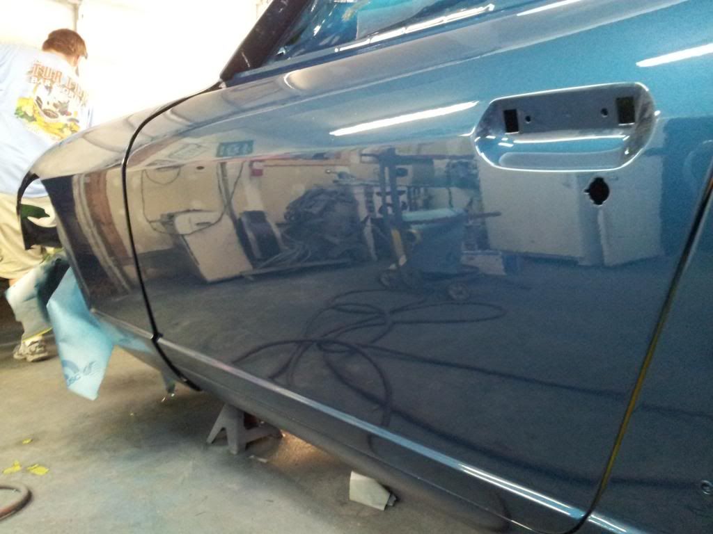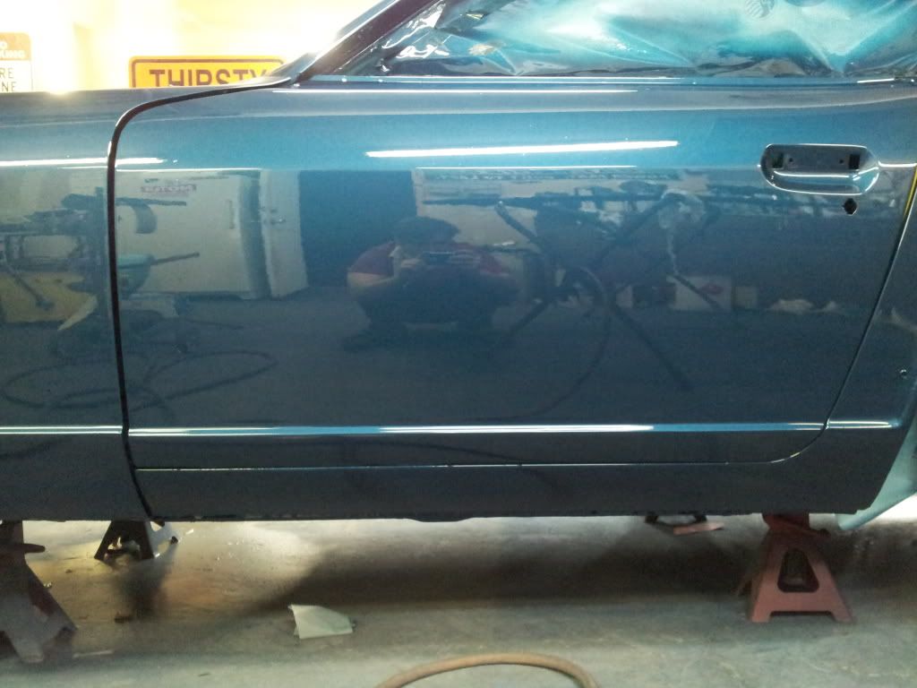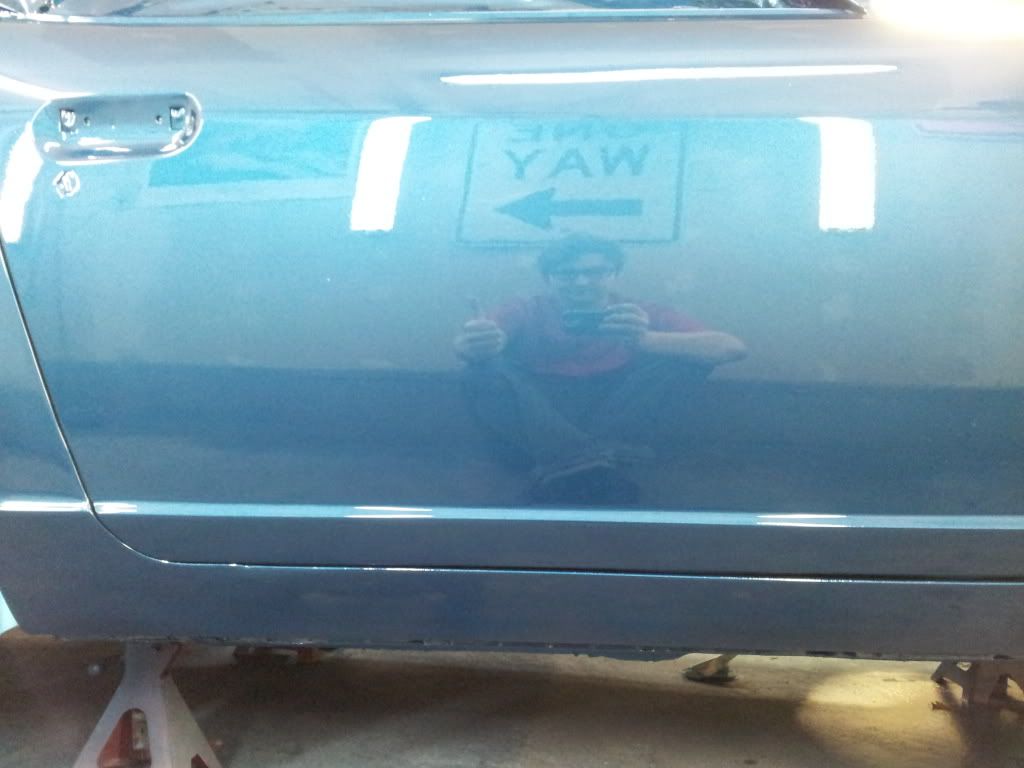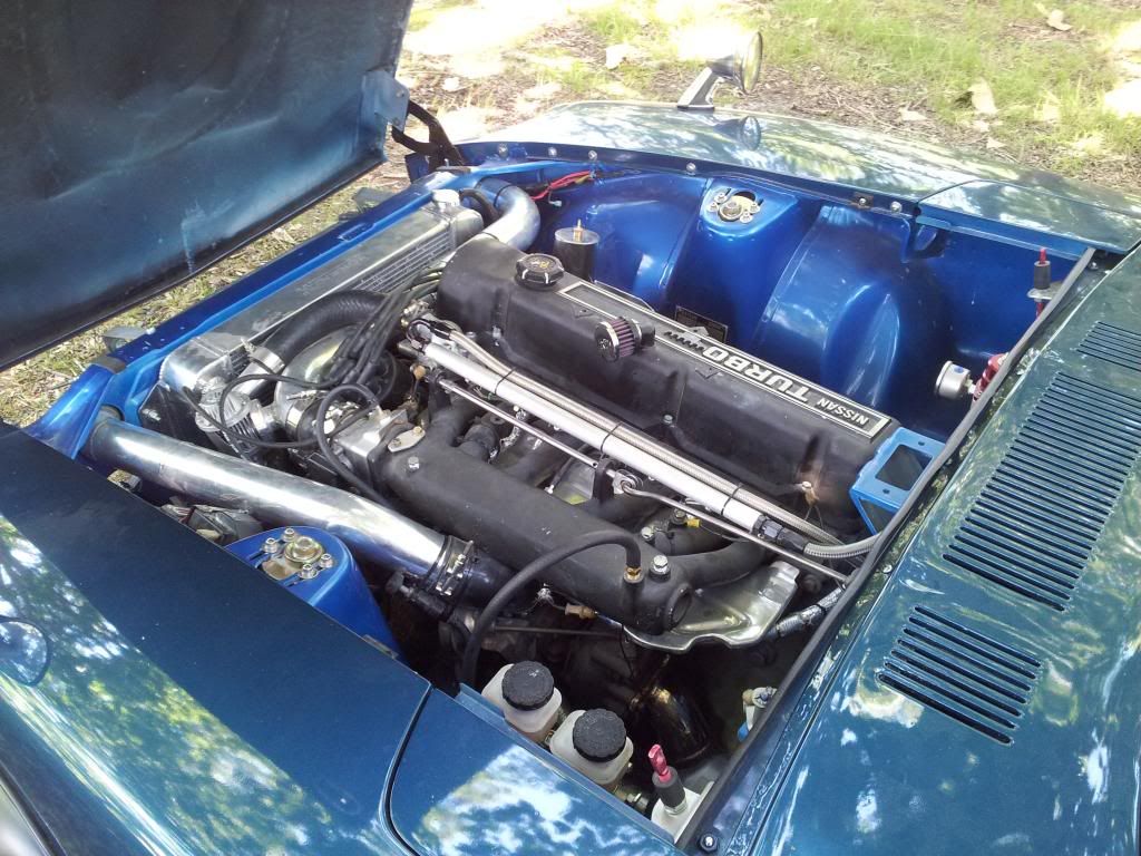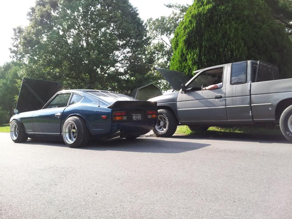 As it nears a road going state. My brother who knows a guy who knows a guy told me about a "rustless" 240Z in a guys garage for the last 30 something years. I said they don't exist but I went and looked anyways. Car is a 11/70, making it a 71. Found it crammed in a garage on casters, with wood working tools, tool boxes, and wood all over it (including the f-ing roof). Fridge magnet test proved it all to be metal of some sort, guys wife gave the owner the angry face, I gave the owner $800, and got it towed home. Original (and solid) floors, crackless original dash. Car was sanded to bare metal, turned up to be all metal, body work took me about a year to do of off and on work. Was missing a lot of parts though. I don't have any pictures of it when I got it, there wasn't much to look at really. This is how it looks today 2 years later, paint work was done in mid January, need to have the now cured paint wetsanded, buffed, and touched up. The fender mirrors and JDM tail lamps are both Nissan original parts I was lucky to get. Still needs some interior bits and bumpers, but it runs awesome, sounds even better. I was particularly proud of the body work, as its my first serious car project, and first time doing body work. The reflections in the panels are flat, and line up better than I could have hoped for. Most S30 people wouldn't agree with what I have done to an early, nearly 95% rustless 240Z. I know I've wrecked the resale value on it, sorry if it offends anyone. I have already had people of the purist sort tell me how I've ruined the car just by describing it to them. Specs are mild: L28ET: Rebuilt, Shaved head, Aeromotive fuel setup w/ adjustable regulator, 2.5" intercooler piping w/ Isuzu Turbo diesel intercooler, 12lb flywheel, shaved crank pulley (single groove), electric fans, Koyo radiator, 12lb boost, Z31 Coil, 10mm tension cables, Pertronix ignitor (Plugs gapped at .46 on this setup), ported intake manifold with 60mm TB. 3" straight pipe exhaust, Braille 11.5lb battery. Fiberglass hood, hatch, poly rear window. Stance coilovers, All poly bushings, Suspension Techniques swaybars, Nismo front control arm spacers, Datsun Comp quick steering knuckles, Wilwood F/R 4pot/2pot w/ separate caliper for parking brake, Wilwood master cylinder. SSR XR-4 Wheels, 15x9.5 -33 and 15x10 -40, Hankook Ventus RS3 tires. Color is closer to home than you would think, its actually Nissan BX7 "Electric Blue" from the D22 Frontier.