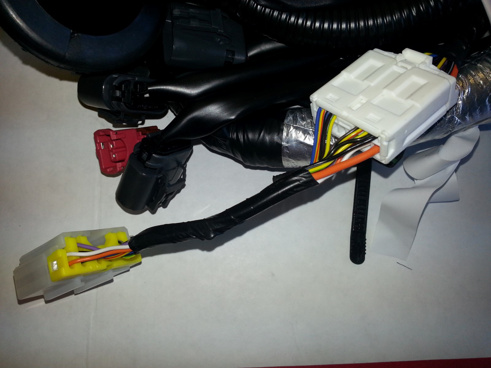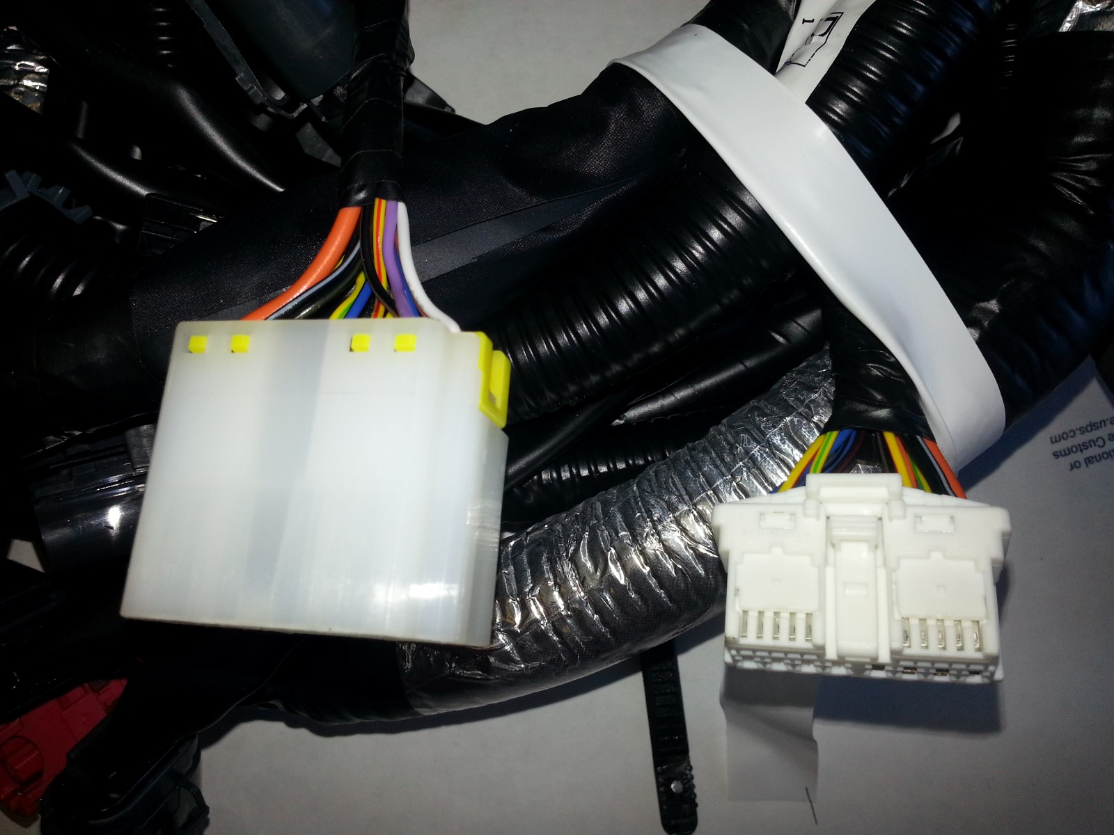 4. The large F2 connector that is difficult to pass through the firewall now has a added quick disconnect. The resulting form factor is about 50% smaller and much easier to fit through the firewall opening without having to risk breaking the connector or de-pinning wires. 5. Sturdier, adhesive back heat reflective aluminum wrap which doesn't fray or pull the way the stock wrap does.