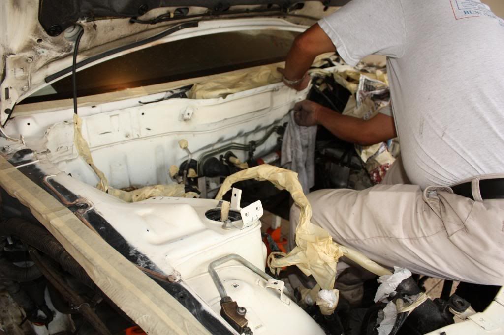 so I sent the engine to the local machine shop to rebuild the had head and the block. They found one bended rod, and said that everything else is within spec including the pistons. They said that everything will be done in a month. So let them do the work. While waiting for the engine, the car will get new paint. My dad know a little about paint, he painted some small boat before, never had painted a car. So I decided to paint my car in the garage . I picked a BMW M3 blue my dad cleaning and prepping the bay