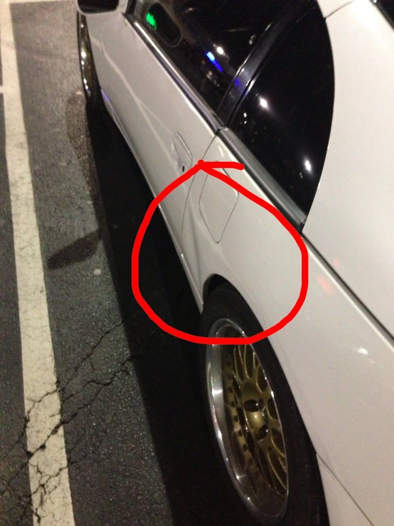 Here's the part that has me really worried..last night I noticed a massive dent behind my driver side door in front of the rear wheel. I remember seeing crash pics on TT.net over the years of z32s being rear ended and the rear fenders buckle just over the rear wheels, which likely made the chassis not worth repair. Check out my pictures below and tell me if you think this might be related to the crash- I realize the dent(or buckle) is in a different place than usual, but it looks like the majority of the impact was made to the driver side of my rear bumper, which could potentially move the spot where the body would buckle(no buckling apparent on the pass side.