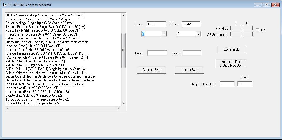 I also wanted to know more about the area on the HD6303 that could be temporarily over-rode like how is done during the active test. I made a window in my software that's hidden that I had used to test addresses, the ability to change them temporarily (like in active test) and check changes to addresses as things are happening by polling the address location. Here is a screen shot of it. It's a little plain and disorganized. It would be great to have the info you have and expand this. I like what you did with your monitoring software. I was looking at your demo videos on YouTube.