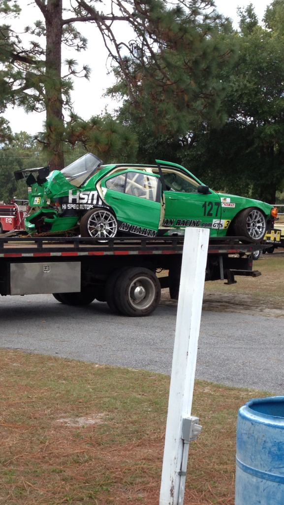 Well, you guessed it. Second session, 2nd lap. Fastest corner on track he loses the back end and wads it up with an instructor in the car. Thankfully they backed it into the trees, and didn't hit head on. Also, thankfully the car had proper safety gear.